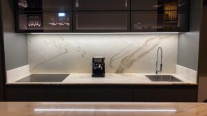 Bancadas e backsplash em Mármore Calacata PT