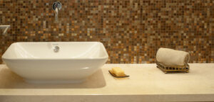 Pormenor casa de banho em Mármore Pele Tigre